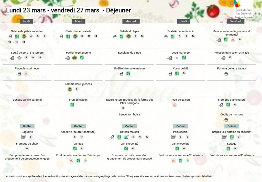 Menus des restaurants scolaires (pont de Buis Les Quimerc’h) : novembre 2025