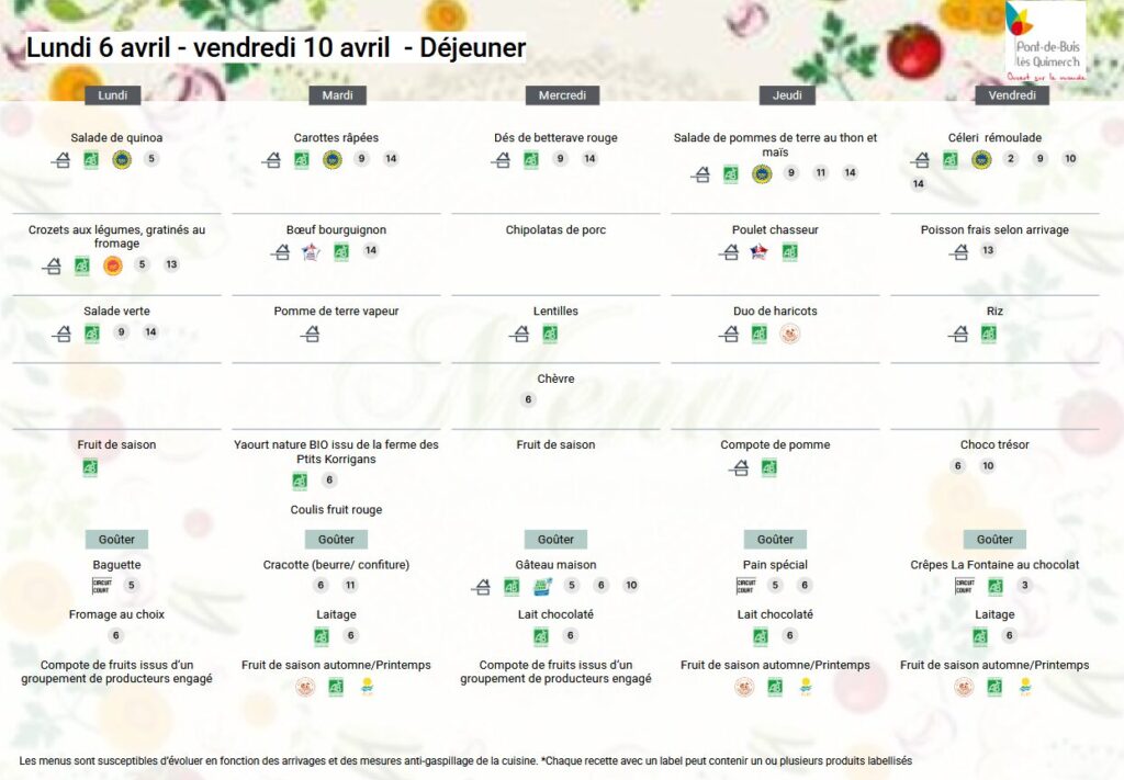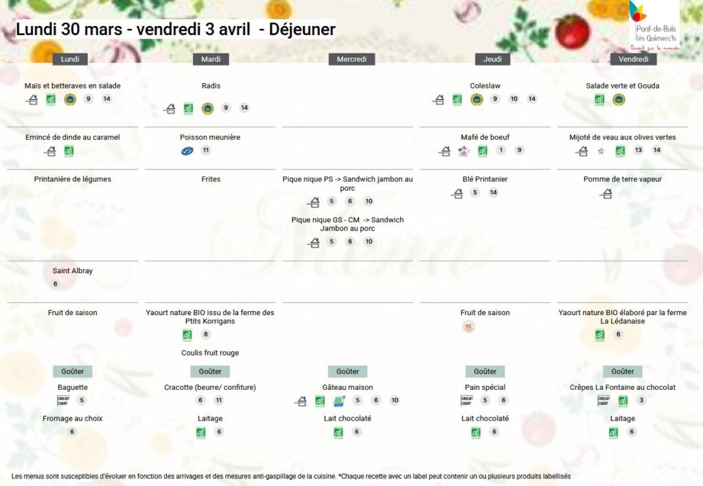 | Les repas sont entièrement préparés sur place ; les cuisiniers favorisent les produits locaux, achetés de préférence en circuit court, tout en y intégrant des produits issus de l’agriculture biologique. Toutes les viandes sont d’origine française sauf l’agneau qui provient du Royaume-Uni. | Exemples de fournisseurs : Volailles : Terre et Plume, le Faou Produits laitiers : Sovéfrais, Ploudaniel Fruits et Légumes : Le Saint, Bourg Blanc Poissons : Brest Marée |